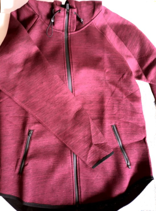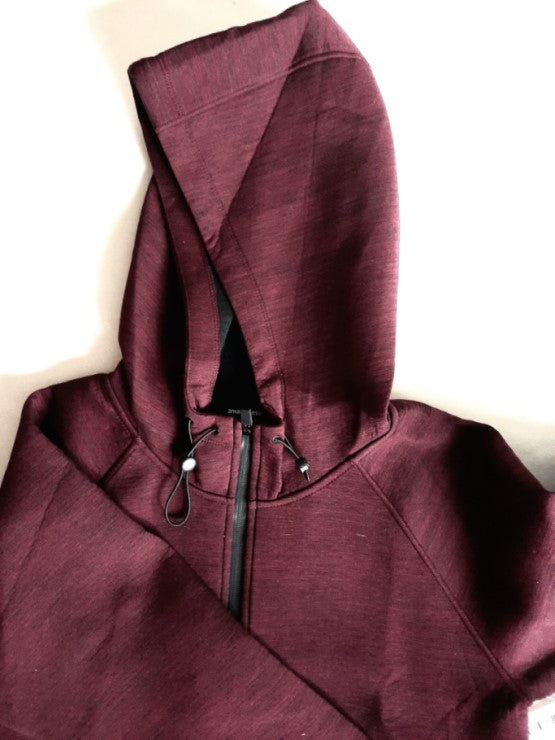 · Size: Small · Color: Burgundy Spacedye · Longer Length · 70% Polyester, 25% Rayon, 5% Elastane · Zipper closure · Features a large size hoodie with functional cord lock adjustments |